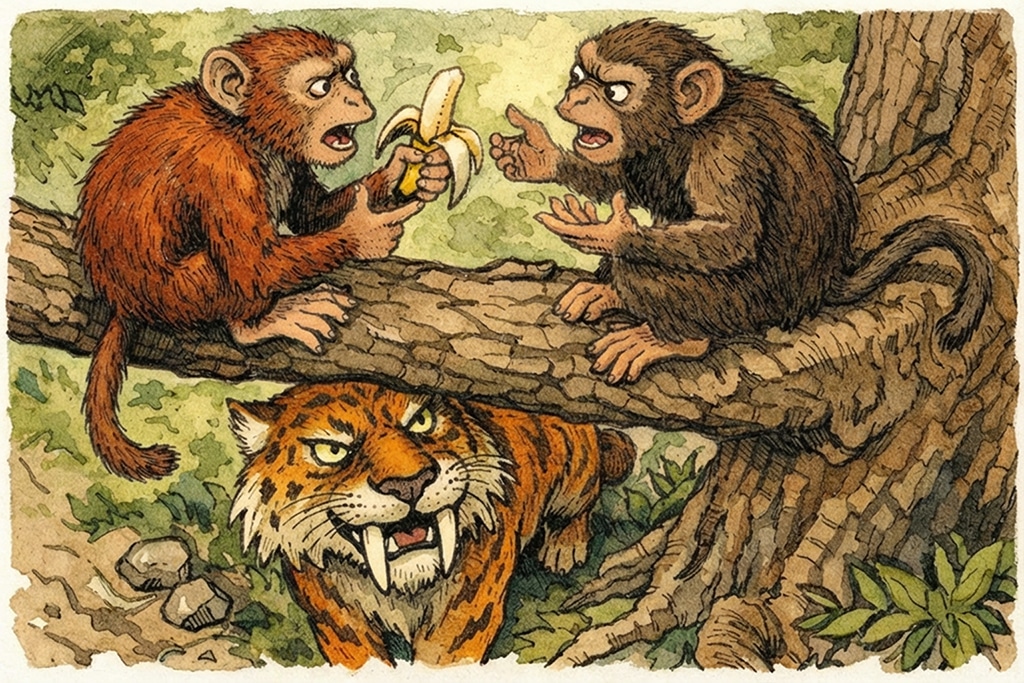 A majom éppen egy félig elfogyasztott banánt nézegetett. Elmerengve ült az ágon, amely – bár ezt ő maga sosem vallotta volna be – az utóbbi időben kissé kényelmetlenné vált számára. Nem az ág hibájából, hanem mert a világ kezdett túlságosan zajossá válni, mintha valaki a közeli tisztáson egy természetközeli élménypark alapkövét rakta volna le.